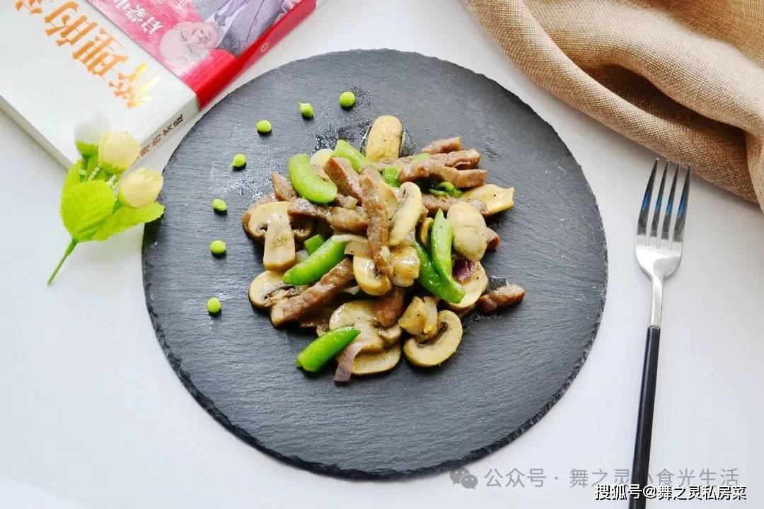 4、热锅冷油将腌制好的牛肉丝放入炒变色即盛出,然后锅内加少许的油爆香洋葱丝,将焯烫过的荷兰豆和蘑菇倒入翻炒片刻,并且加入适量的盐调味。