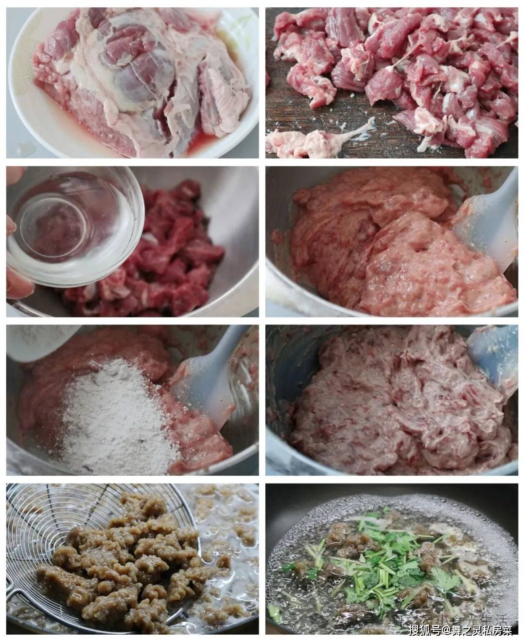 1、把牛肉顺纹理切片再切丝,记得筋膜要剔除, 然后放入料理机中,分成加入冰块一直搅打到上劲粘稠的状态。