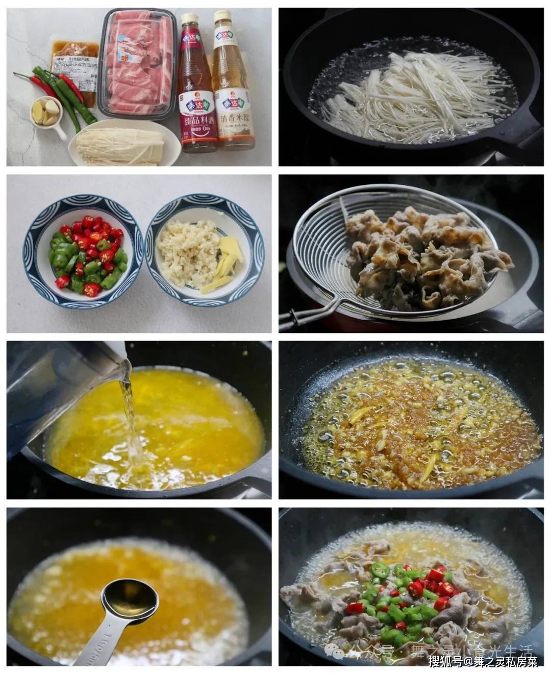 3、等酱汁煮开了然后将焯烫过的肥牛肉倒入,将青红辣椒也一并加入,继续烧开,就可以直接连汤一起盛出来装入之前放金针菇的碗里面了。