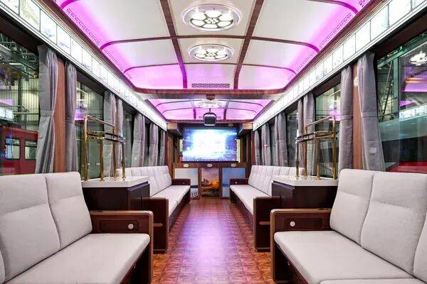 列车外观融合长春新民大街巴洛克建筑风格,内饰采用回纹雕栏、弧形穹顶等传统元素,座椅颜色取自长春市花君子兰的墨绿色。车厢内还设有茶室、咖啡厅、餐吧等功能区,为游客提供沉浸式文旅体验。文献[10]描述其“仿佛让人在时光中穿梭”,成为移动的城市文化名片。