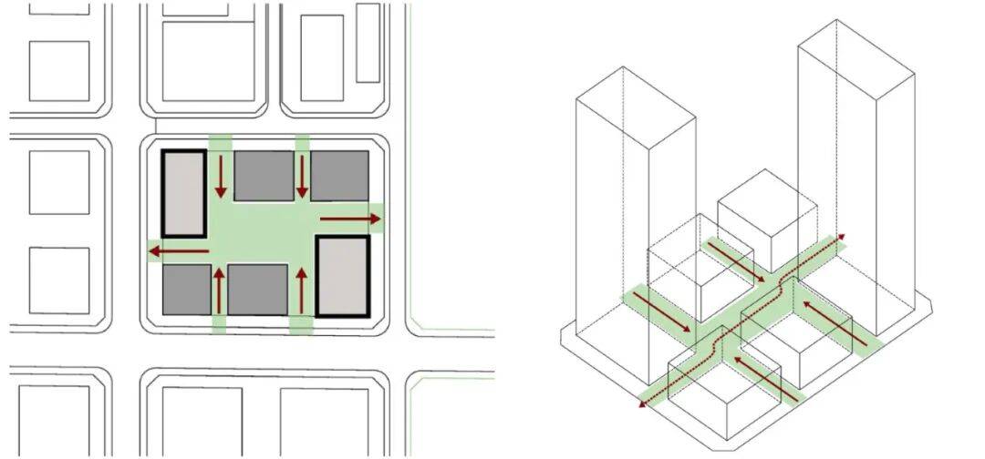 - 水平渗透,垂直蔓生:底层通过口袋公园、街巷广场与中央绿轴无缝衔接,形成流动的城市界面;垂直方向以连廊、露台和空中院落构建立体生态系统,在严谨网格中实现自由生长。