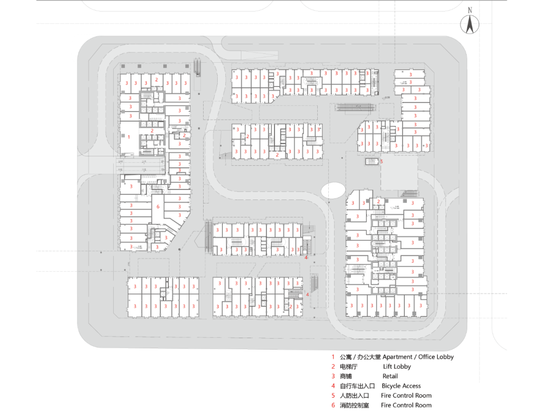 设计以立体叠合的公共空间系统,构建从城市到建筑的多维连接体系。首层通过嵌入口袋公园与蜿蜒街巷,柔化地块边界,使绿意如溪流般漫入城市肌理,形成与中央绿轴及相邻地块的柔性渗透;二层以架空连廊编织出一张充满温度的步行网络,将人群、公园与光影温柔串联,激发区域慢行活力。