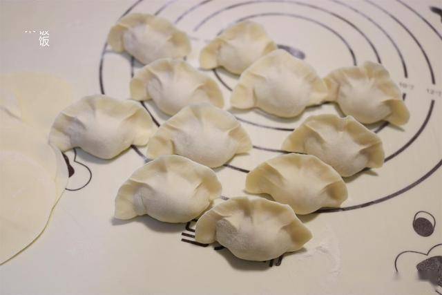 9,擀成饺子皮,放入馅料,捏成饺子。