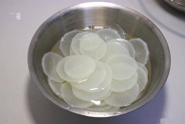4,白萝卜去皮切片,开水煮2分钟,捞出来用凉水淘凉。