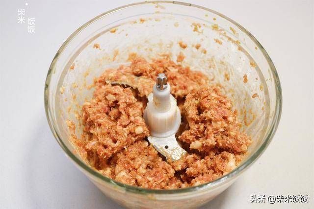 6,二八肥瘦的猪肉,加葱姜末、盐、老抽、生抽、松茸调味料,少许凉开水,绞打成肉馅。