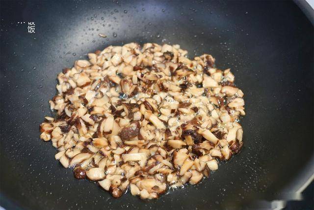 2,香菇泡发,切成丁。热锅热油,把香菇大火炒干水汽。
