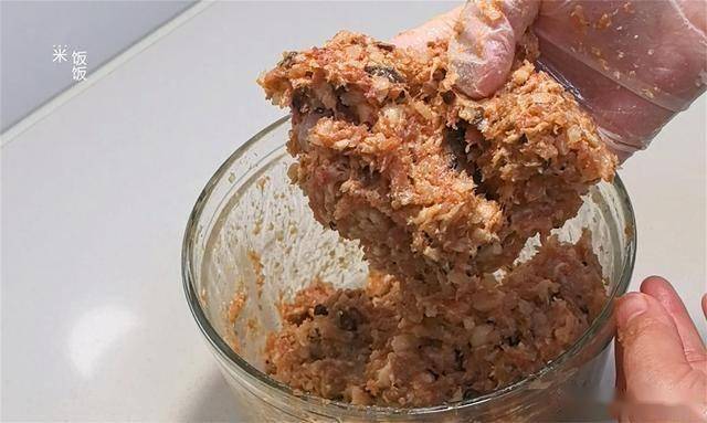 2. 调馅    肉馅+白萝卜末+香菇末    沿一个方向搅拌至粘稠,加鸡蛋、料酒、鸡精调味 ;部分做法建议炒香香菇后再混合