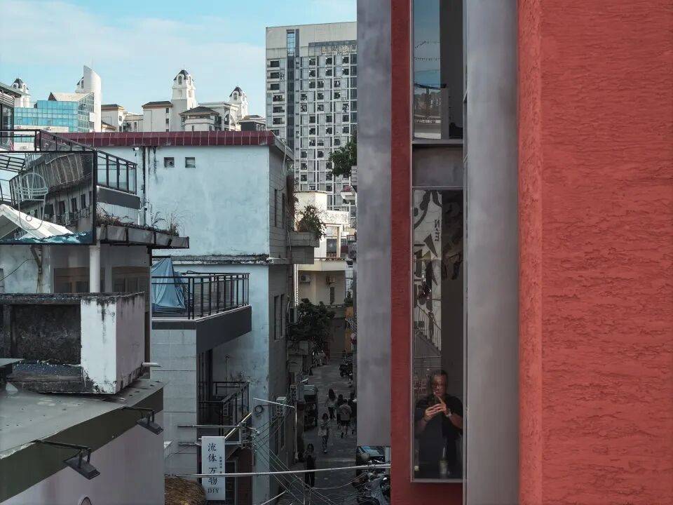 狭窄的街巷,逼仄的楼距,宅基地的日常。阳光,空气,视线都来自于这些竖向狭长的缝隙。穿街过巷人们忽略的日常琐碎,我们想给它赋予意义,这些城中村的在地基因给了我们立面改造的启发。我们想让人们重新去凝视这些缝隙,留意那些被遗忘的附近。立面上这些细长的窗框使得人们透过独特的视角去发现,去观察,去记录。外部的场景镶嵌在室内观展的过程中,生活的剧目被有趣的发现,并定格在一帧一帧的画面当中。