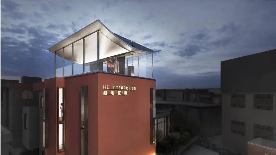 在四楼的屋顶,我们置入了一个轻盈的体量,形状既像一双起飞的翅膀,又像是赠与社区的一弯微笑;两侧纤细的排柱撑起了反拱的体量,在这里将会迎来多种形式的艺术活动,他就像一个檐下的社区磁力场吸引着周遭不同的人群前来探索究竟,到了晚上它又犹如伫立的灯塔在旧村之中熠熠生辉。