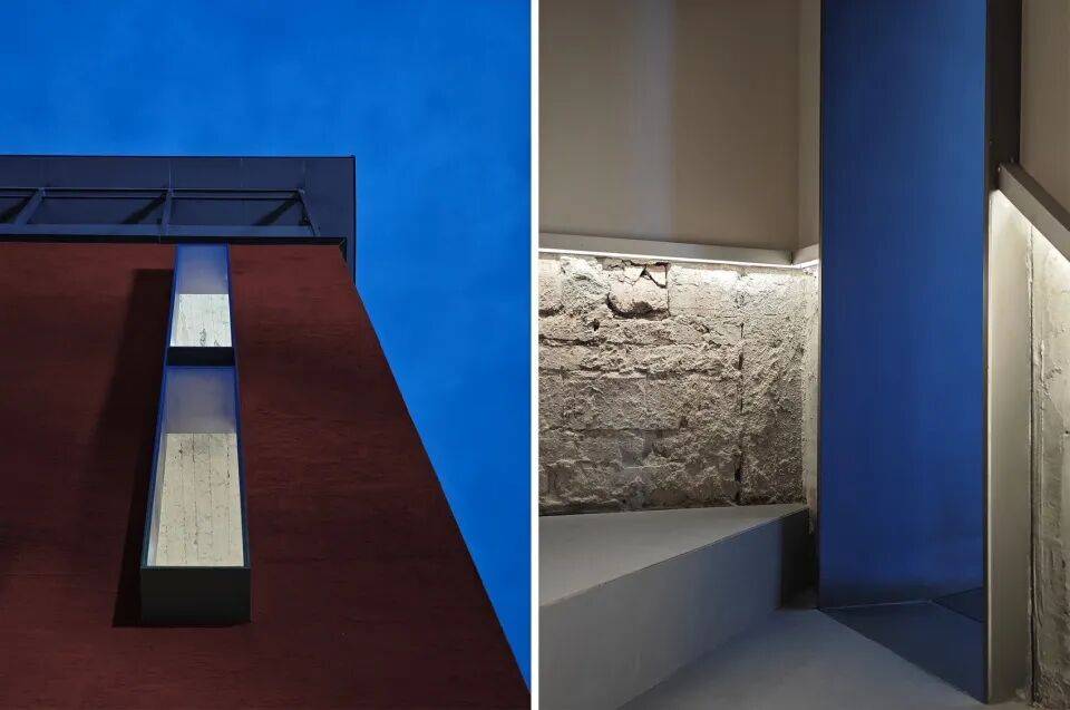 瘦窄的长窗嵌在厚重的墙体之内,形成了立面的缝隙。建筑内外的窥探成为了互动的日常。夜幕随来,外面天色映入的蓝调仿佛为窗套上了一层颜色,也为室内的氛围加添了一份迷幻的色彩。