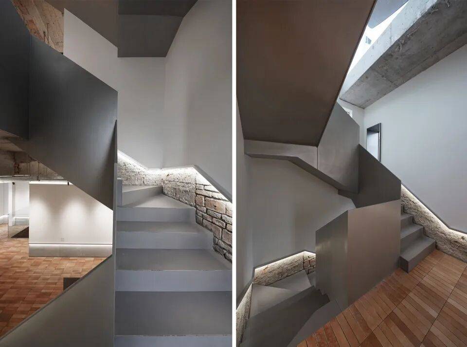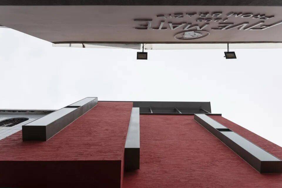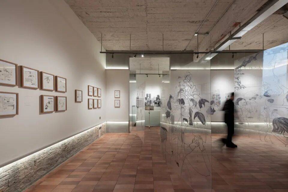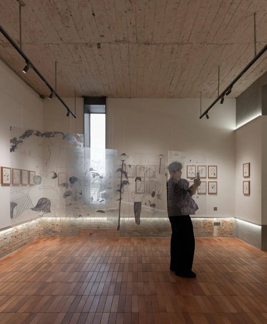 在建筑的内部,我们把室内原有的腻子刮掉呈现出建筑结构原初的样子,使得被隐藏在装修下的历史信息得以呈现:原真的混凝土楼板和红色的砖墙作为建筑的历史图层;在离地500——2900mm的高度设置白色的展墙作为当下的时间图层。两个图层对比营造出新旧的反差感,岁月的痕迹得以体现。地面选择了红色仿古砖与墙脚粗糙的红砖形成对话,铺装的纹路追随了顶部混凝土楼板的木纹方向,天、地、墙形成了新旧信息叠加的有机整体。而室内红砖也与建筑室外的红色肌理漆形成了内外呼应,使得整体上更浑然天成。