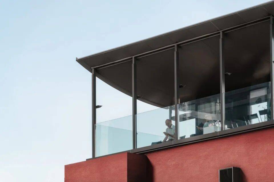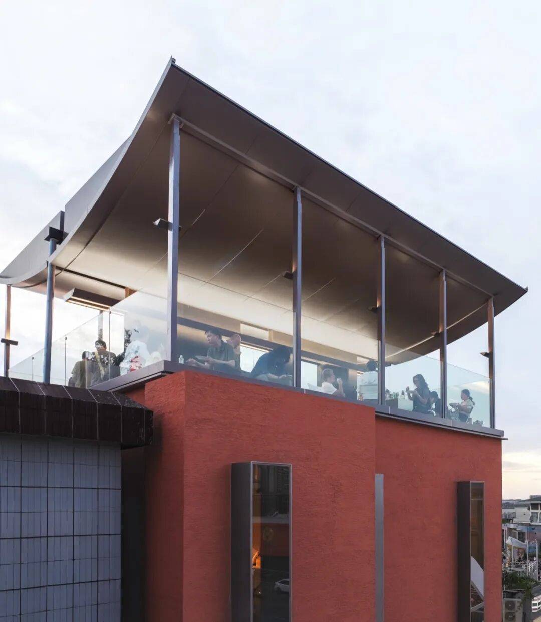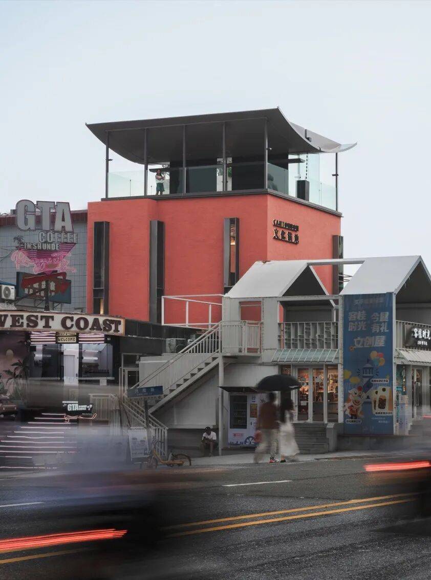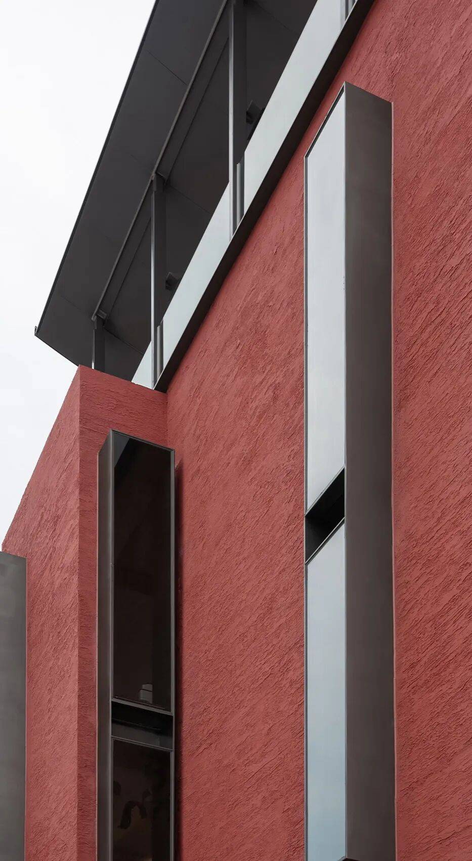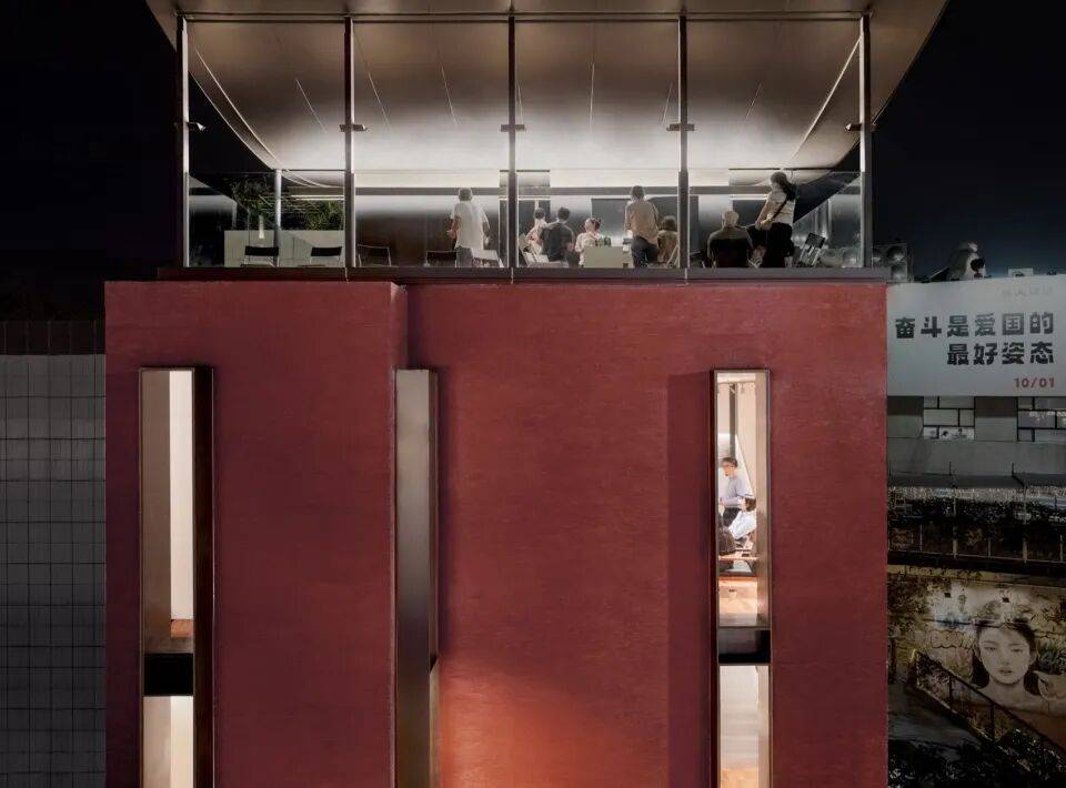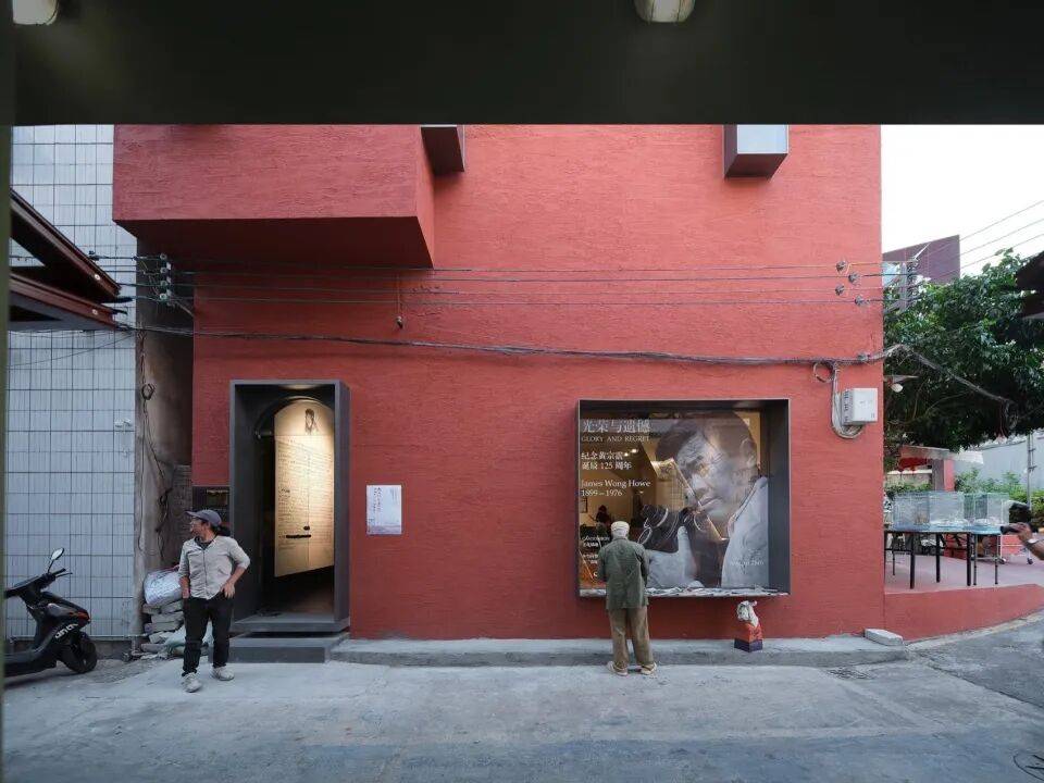 红色的体量面向街巷吸引着附近路人的目光,在厚实的红墙中镶嵌着纤薄的金属窗框,悬飘的窗台放着有关展览的介绍和海报,路人驻足停留观察内部的展览,时而更新内容的窗台形成了一个与社区互动的场域。与顶部充满精神性的屋顶体量不一样,底下伫立于街巷的红色体量总是弥漫着街坊的家长里短和烟火气息,我们戏称这两部分叫“头顶仪式,脚接地气”。