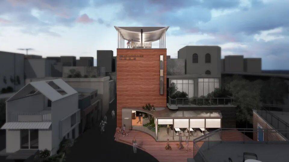 回应第一个问题——来自于在现场的观感激发,无论从塔楼住宅的俯瞰,还是在村口的仰望,又抑或是旧厂广场的远眺,这栋建筑的位置都极具昭示的作用。我们希望利用四楼的天台,塑造如同江边灯塔一般的精神高地,点亮周边社区的艺术活动,给这“消失的附近”带来呼唤与集结的信号。