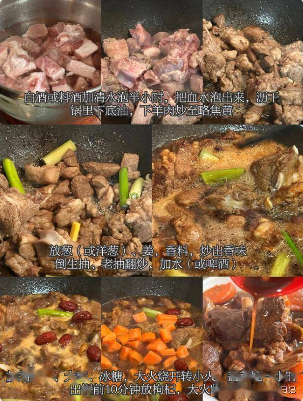 材料:适量羊肉,白酒,料酒,葱,生姜,香料,生抽,老抽胡萝卜大枣,枸杞,
