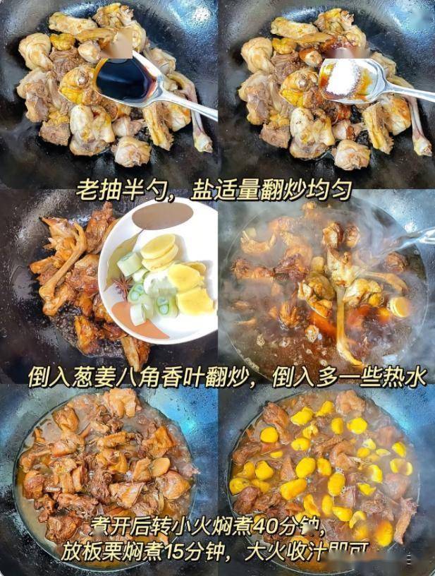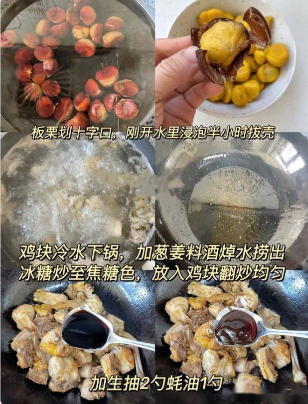 材料:适量鸡肉,适量板栗,葱姜八角,香叶,老抽, 适量盐,生抽,蚝油,冰糖。