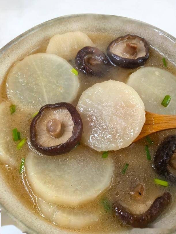 材料:一根白萝卜,适量干香菇,1勺生抽,1勺蚝油,少许盐,八角,生姜,葱花。