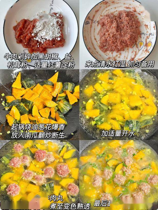 材料:适量牛肉, 适量南瓜,黑胡椒,盐,红薯淀粉,葱花。