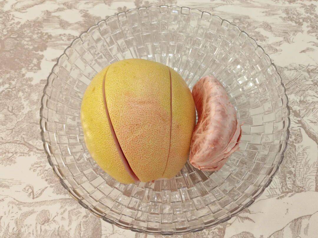 3. 准备果肉:趁这个时间,我们来剥柚子肉。把柚子白色的厚皮和筋膜尽量去除干净,只留饱满的果肉瓣,掰成小块备用。记得把籽也去掉哦。