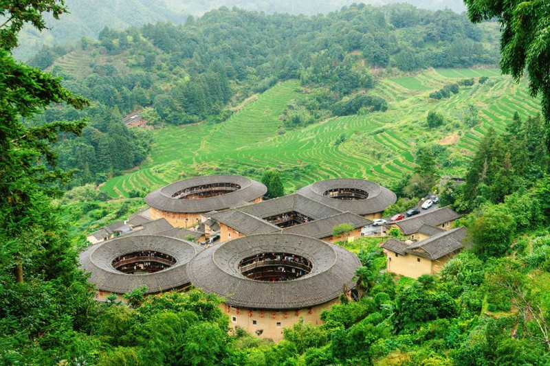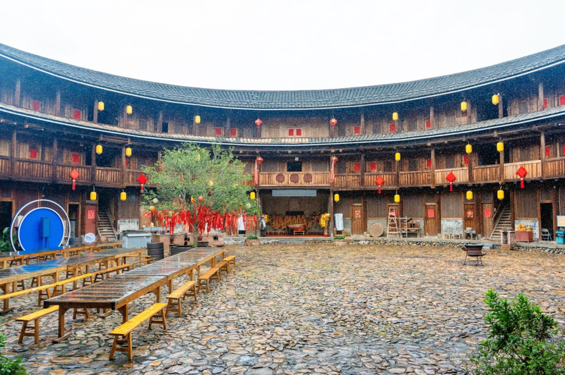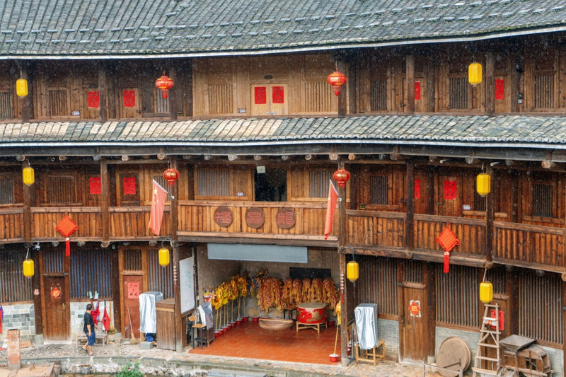 下着雨,楼上还在喷水雾,氛围有了,没有出片。开车没多久来到了四菜一汤景区,验票后又延绵十几公里的山路,到达了观景台。迅速抢占有利地势拍了合影。看完全景,开车去看楼里。进了方的土楼,圆的土楼,啊,土楼好小啊,前面那个民宿真的是巨大的土楼了。