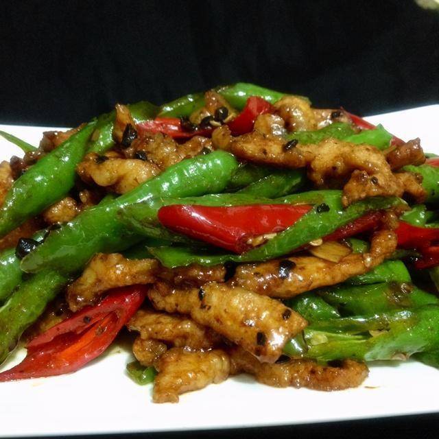 4:在放入辣椒,食用盐,炒制辣椒起白泡了,放入腌制好的瘦肉,炒熟后在放一点老抽上色,翻炒两下就可以出锅了!