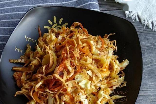 食材:白菜心、豆腐皮、胡萝卜、盐、生抽、油辣椒、食用油、花椒、