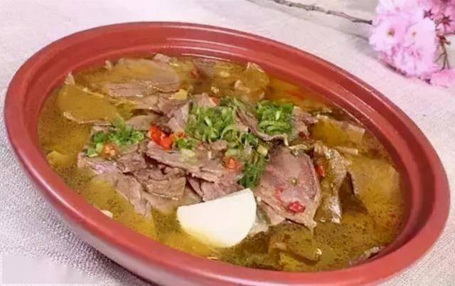4、锅入底油烧热,下入葱花、姜片各10克、泡椒碎20克煸香,加入酸菜块翻炒出香,添压牛肉的原汤800克,调入白醋10克、味精、鸡汁各8克、鸡精、盐6克、白糖3克,烧开之后捞出酸菜码入碗中,在锅内酸汤中放入切好的牛肉片,中火煮至入味后起锅盛入垫酸菜、酸萝卜的碗中,撒少许葱花。