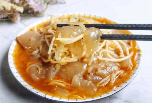 2、酸白萝卜100克,切成薄片,焯水后放入碗中垫底。
