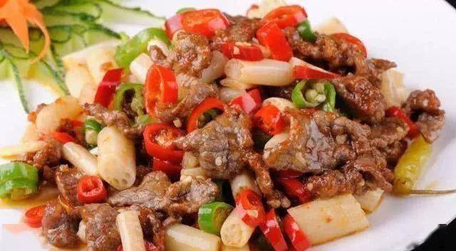 食材:里脊牛肉、小藕、红椒、青椒、泡椒、淀粉、盐、香油、酱油、油、大蒜、生抽、蚝油
