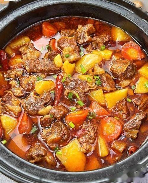 5. 土豆、胡萝卜切滚刀块,牛肉炖到能插入筷子时加入,继续盖盖炖15分钟,土豆边缘微浑正是软糯信号。