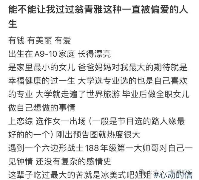 关于翁青雅"顶级白富美"人设翻车事件,综合全网热议内容,核心争议点及舆论反应如下:
