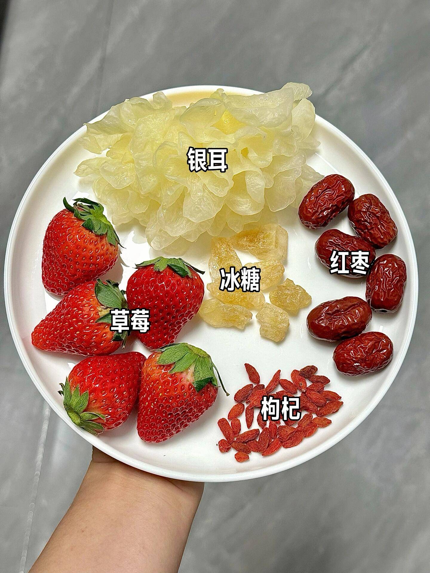首先,我们来看看需要准备哪些食材。这道羹的主要食材有草莓、银耳、冰糖、红枣和枸杞。这些食材不仅容易买到,而且价格也都很亲民。