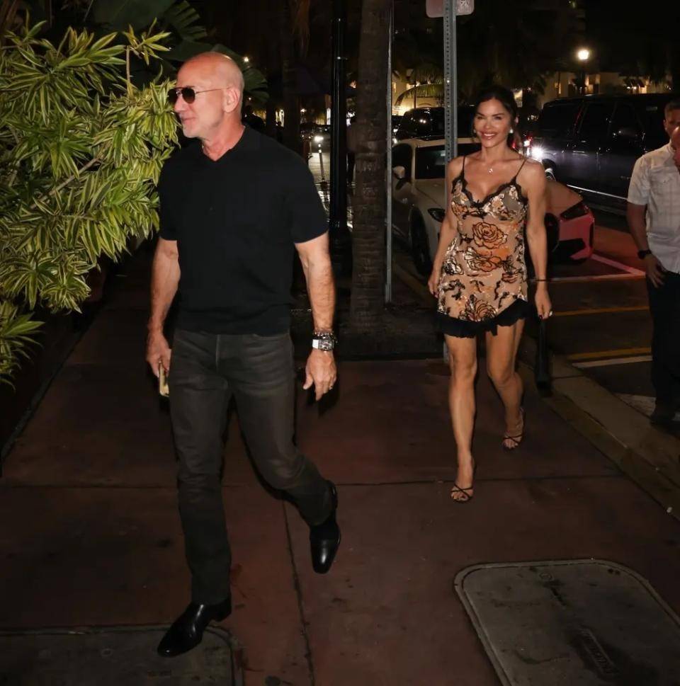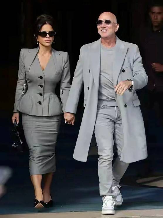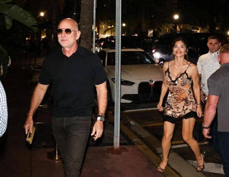 而一向喜欢出头的桑切斯,这次却给克里斯·詹娜当起了陪衬。她穿了一条黑色长裙,默默地站在克里斯·詹娜身后。不过,桑切斯向来是个风格多变且极具话题性的人物。此前贝佐斯和她出席活动时,贝佐斯一身蓝衬衫沉稳低调,桑切斯穿着白色高领针织衫配直筒裤,干净又高级,让不少网友对她改观,称赞她变优雅了。然而,这次在克里斯·詹娜生日宴上,她又切回“未婚模式”,造型大变。她身穿肤色底、黑色花纹的细带吊裙,低胸设计大胆,裙边非对称剪裁,配上绑带高跟鞋,整个造型更像是夜场出街而非晚餐约会。走路时她姿态独特,一边肩高一边低,手臂甩得飞起,脚步轻飘,虽身材有肌肉线条但比例不算好,手臂结实、腿偏短,这一露全暴露在闪光灯下。贝佐斯则大步在前,神情淡定,不牵手、不回头,两人形成鲜明对比。桑切斯如此大胆的穿搭,引发了网友的纷纷议论,有人调侃她是去吃饭还是拍MV,也有人认为她活得潇洒,不在乎别人看法,毕竟她有着“我喜欢,我能驾驭,我就穿”的底气,而且作为贝佐斯的妻子,她似乎想通过这种独特方式展现自己的存在感,即便造型被指“夜场风”,她身上的珠宝依旧闪耀,钻石耳坠、镶钻项链、戒指等尽显奢华,她似乎想用“贵”掩盖“俗”。