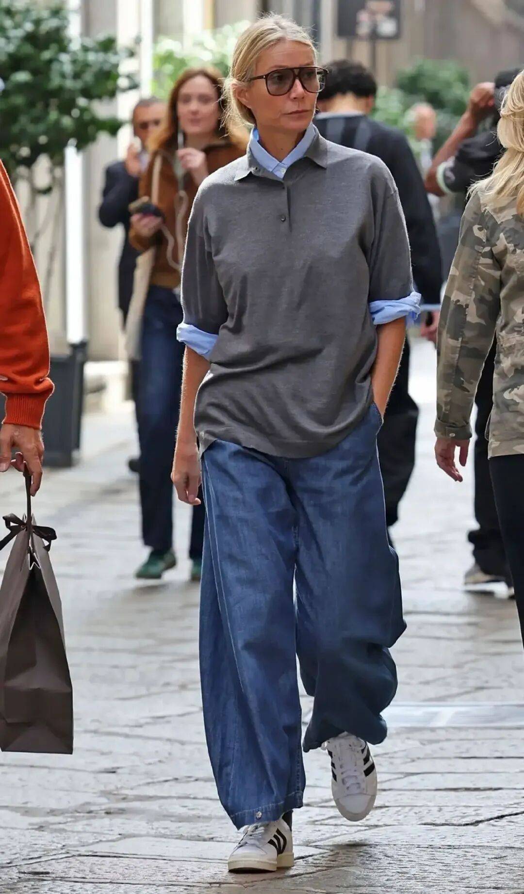 她在意大利米兰街头被拍到的这一身就很好看,灰色五分袖针织 polo 衫,内搭蓝衬衫,牛仔裤宽松到像运动裤一样舒服。