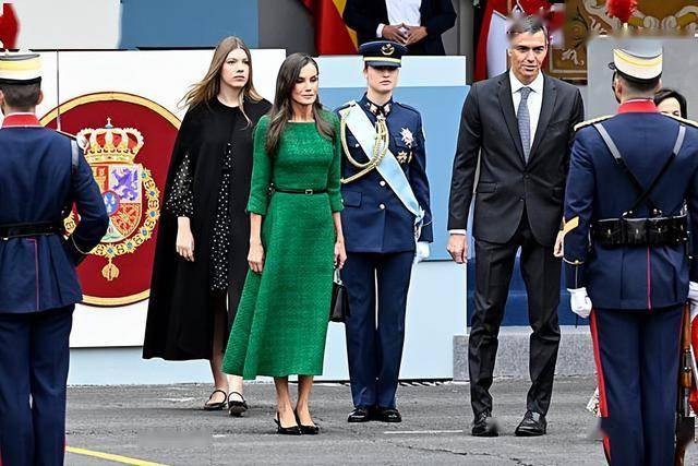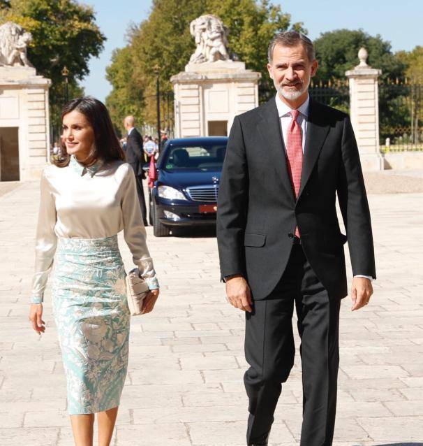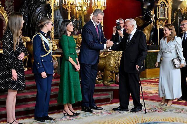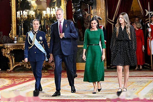 费利佩国王身穿蓝色西服,莱蒂齐亚王后则穿了一条绿色的裙子。