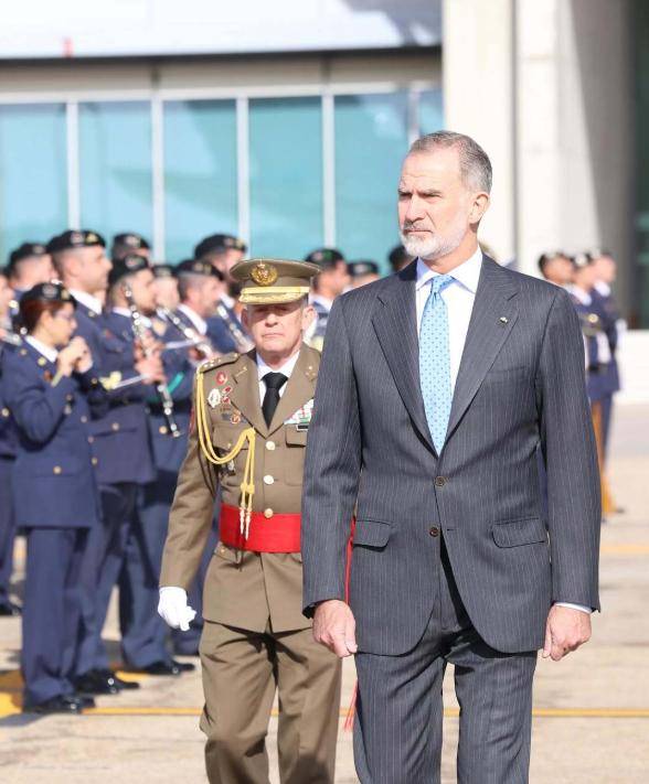 费利佩国王的专机降落后,接机团队为他和王后准备了满满的礼遇。舷梯上铺上了红毯,甚至为国王夫妇准备了鲜花,足见接待的精心与庄重。国王一身高定西服,搭配淡蓝色领带,举手投足间尽显成熟男人的魅力,尽管他略显老成,胡须已全白,但依旧展现出国王应有的威严与气度。高大魁梧的身形让他更具王者风范。