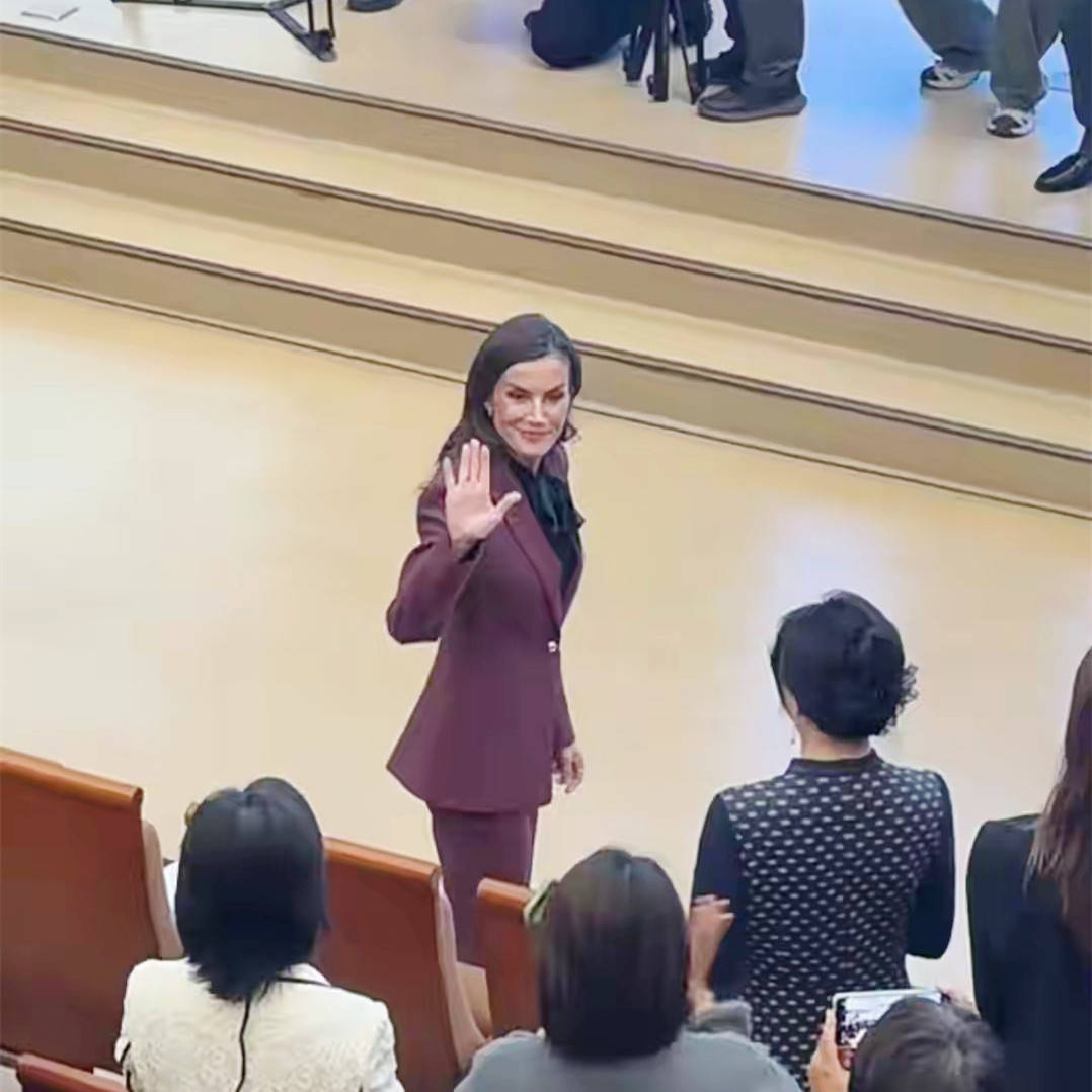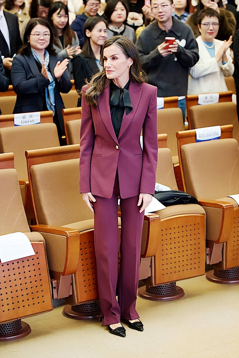 走进北京外国语大学,莱蒂齐亚以一身独特而秀气的深红色西装亮相,内搭黑色衬衫,色彩搭配经典而绝美,职业感十足。“西装是女性力量的象征,每一粒纽扣都藏着自信。” 这身造型与她曾担任新闻主播的职业经历相呼应,尽显干练与专业。