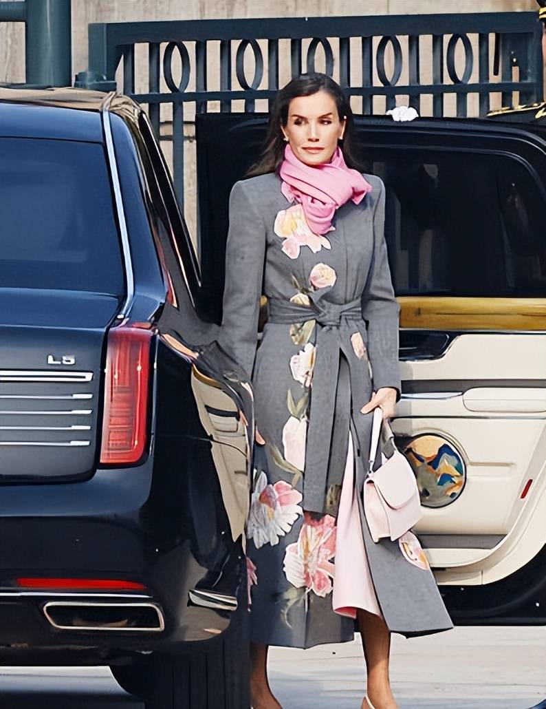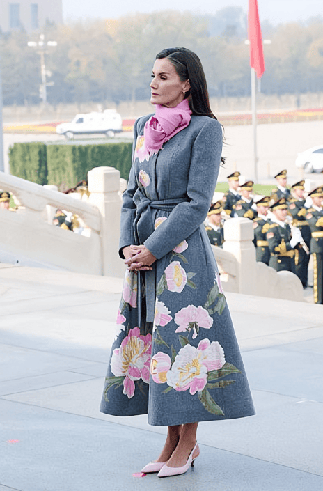 11月14日在北京的日常行程中,莱蒂齐亚王后穿着山茶花(或牡丹)图案的修身系带长袍亮相。这身造型让中国粉丝好感倍增,尤其是脖子上的粉色围巾,唤起了人们对80年代中国女性服饰的记忆。文章[5]提到:"鲜艳的牡丹大花朵国色天香,很符合我们的审美。"尽管北京十一月气温较低,她仍坚持露出脚踝的传统优雅穿法,即使"冻得发抖脚后跟有点红",也展现了对时尚理念的执着。
