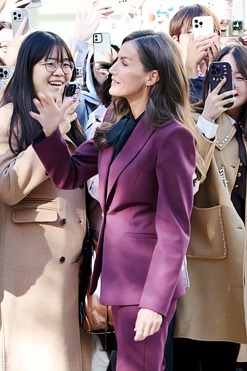 11月10日,莱蒂齐亚王后与费利佩国王抵达成都时,身着一袭紫红色粗花呢连衣裙亮相。这件由可可·香奈儿设计的经典单品,不仅彰显了王后的高级品味,更在细节处融入了东方美学。裙摆的剪裁流畅而富有结构感,搭配西班牙传统耳环,中西元素巧妙碰撞。