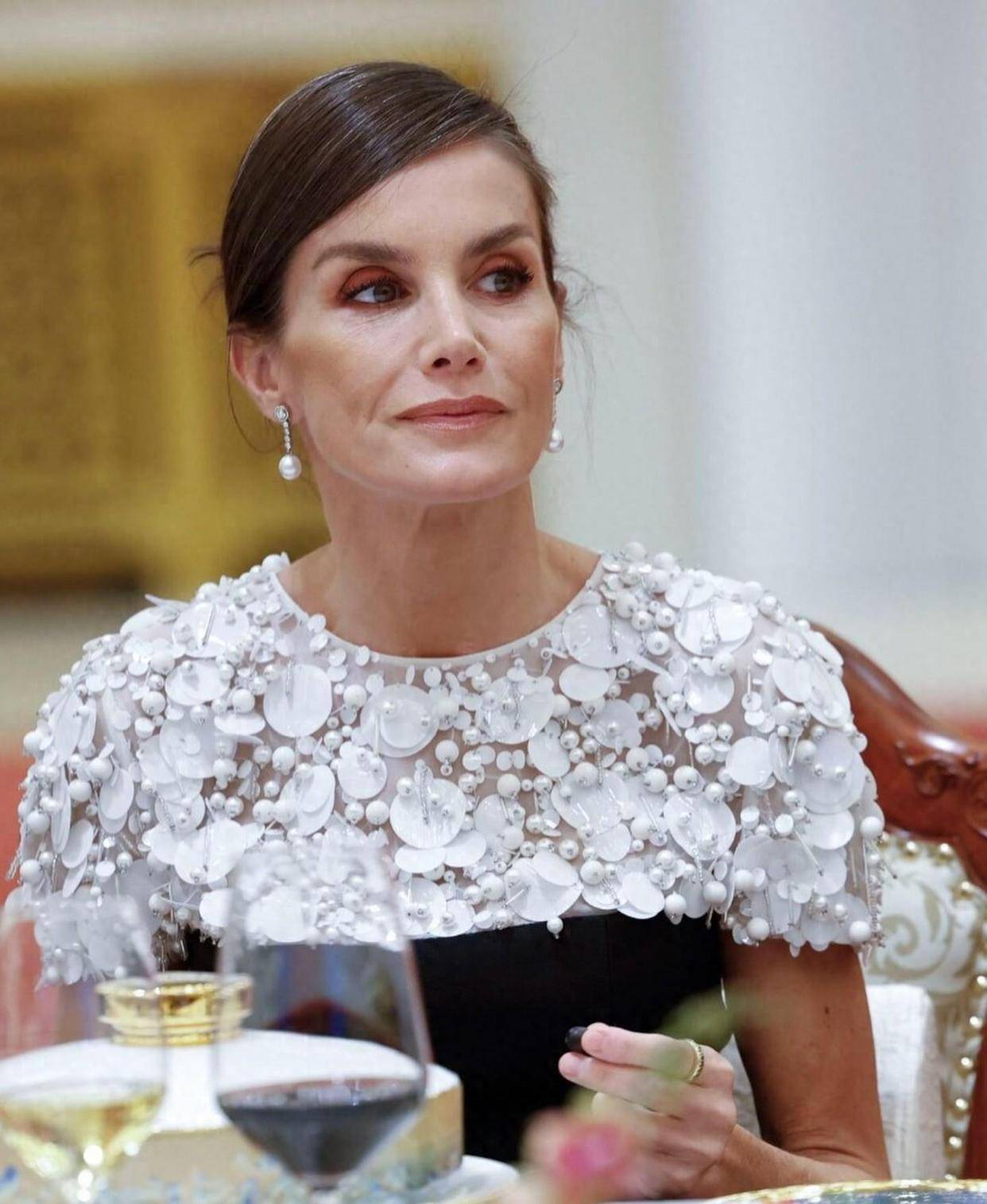莱蒂西亚王后戴了一副简洁大方的珍珠耳环,那条裙子的亮片部分设计成了小披肩的样子。她平常一直坚持健身,所以身材特别紧凑,这么苗条的手臂,加上小披肩的点缀,真是既纤细又修长。