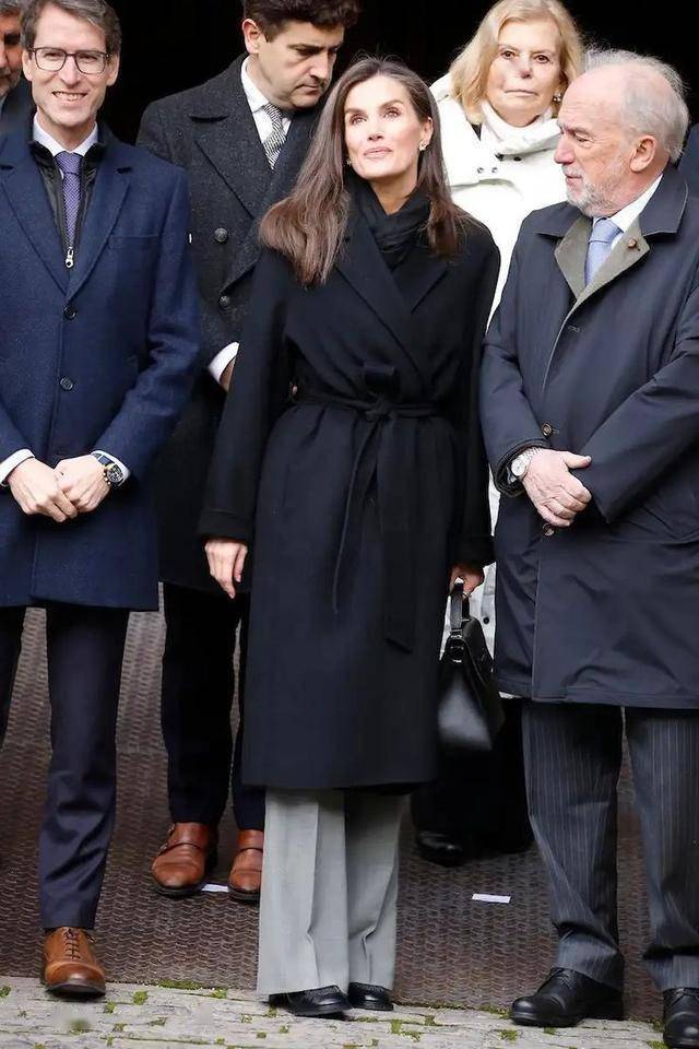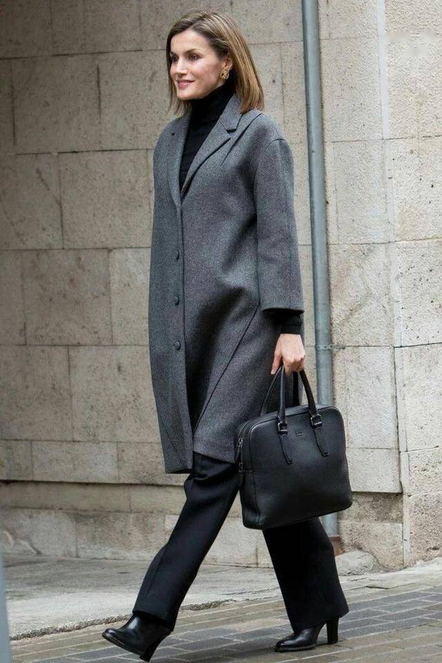 今年流行的格雷系穿搭,西班牙王后早就尝试过了!灰色直筒大衣配黑色西装裤,尽显高智大女人风范儿。