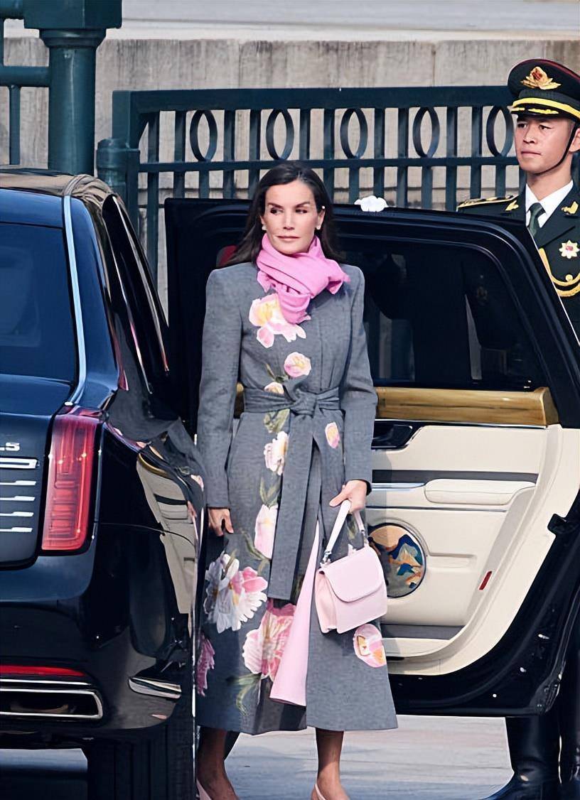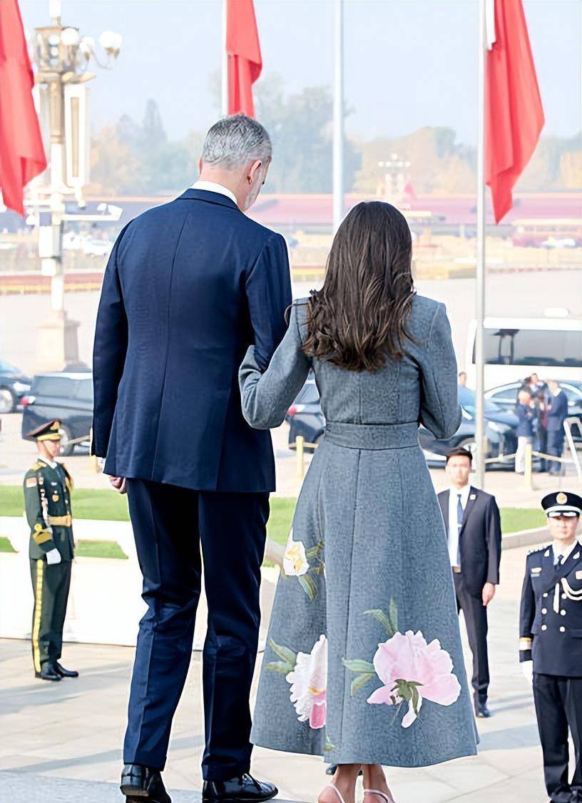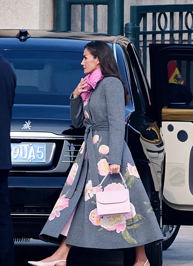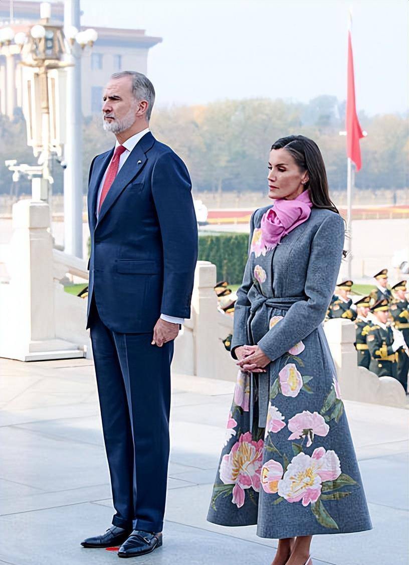 莱蒂西亚王后当天换了好几套衣服。在盛大的欢迎仪式上,她身穿一件灰色的牡丹花刺绣大衣,但脚上配的是露脚后跟的凉鞋。有网友就说了,北京都快这么冷了,穿凉鞋不会觉得冷吗?