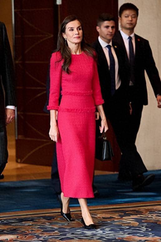 在成都活动期间,莱蒂齐亚的红裙格外引人注目,简洁的圆领设计,袖口与腰部的毛毛装饰令她在寒冷的十一月里倍感温暖。虽然已经53岁,但她的自律让她依旧保持着性感的身材。细腰、修长的脚踝和挺拔的身姿,无论在人群中如何比较,莱蒂齐亚无疑是最为完美的存在。