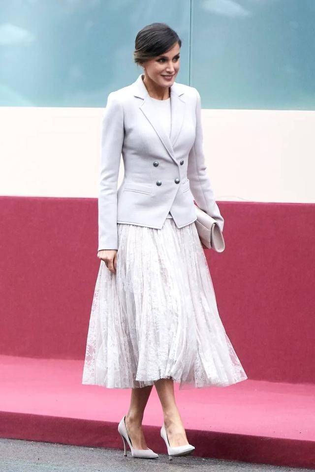 出席正式场合的时候,莱蒂齐亚王妃更注重得体的气质,遵循“配色简约、版型合体、材质高级”的搭配法则。