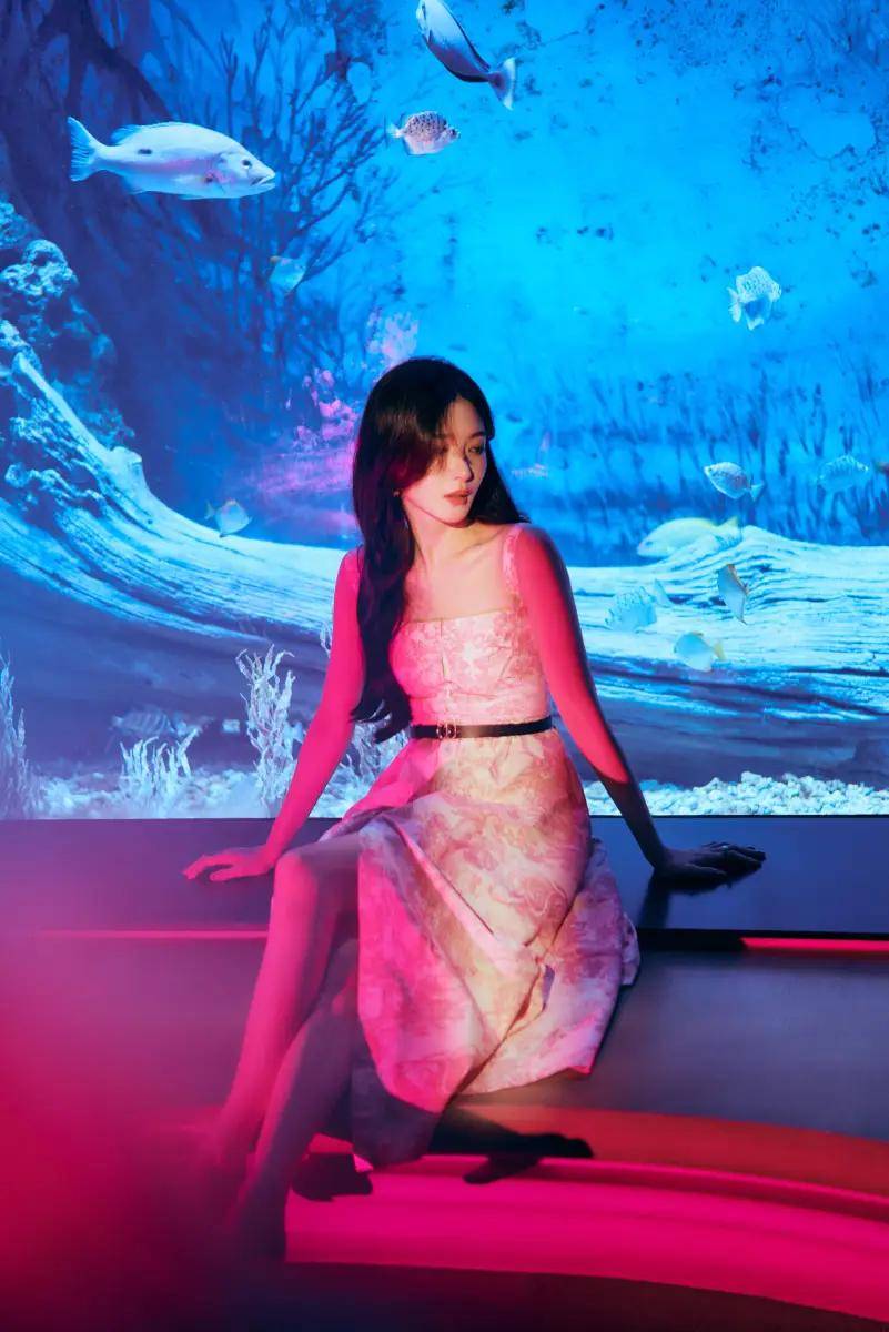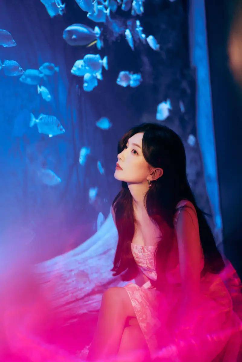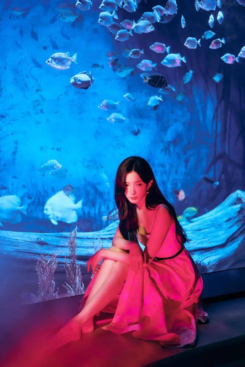 她坐在水族馆的玻璃墙前,粉色的灯光洒在她身上,为她披上了一层梦幻般的光环。