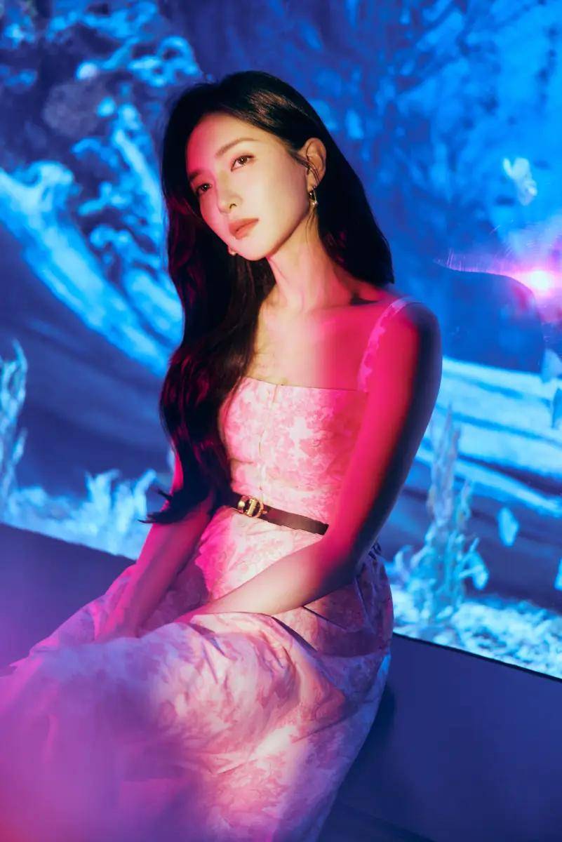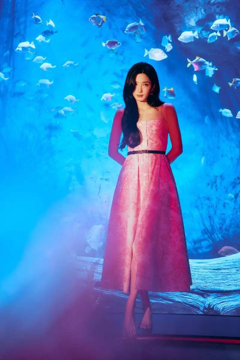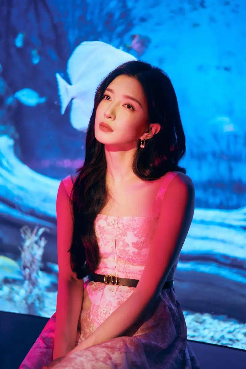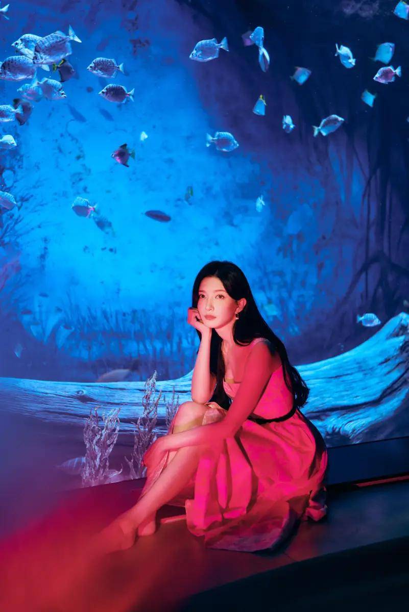 她坐在水族馆的玻璃墙前,粉色的灯光洒在她身上,为她披上了一层梦幻般的光环。