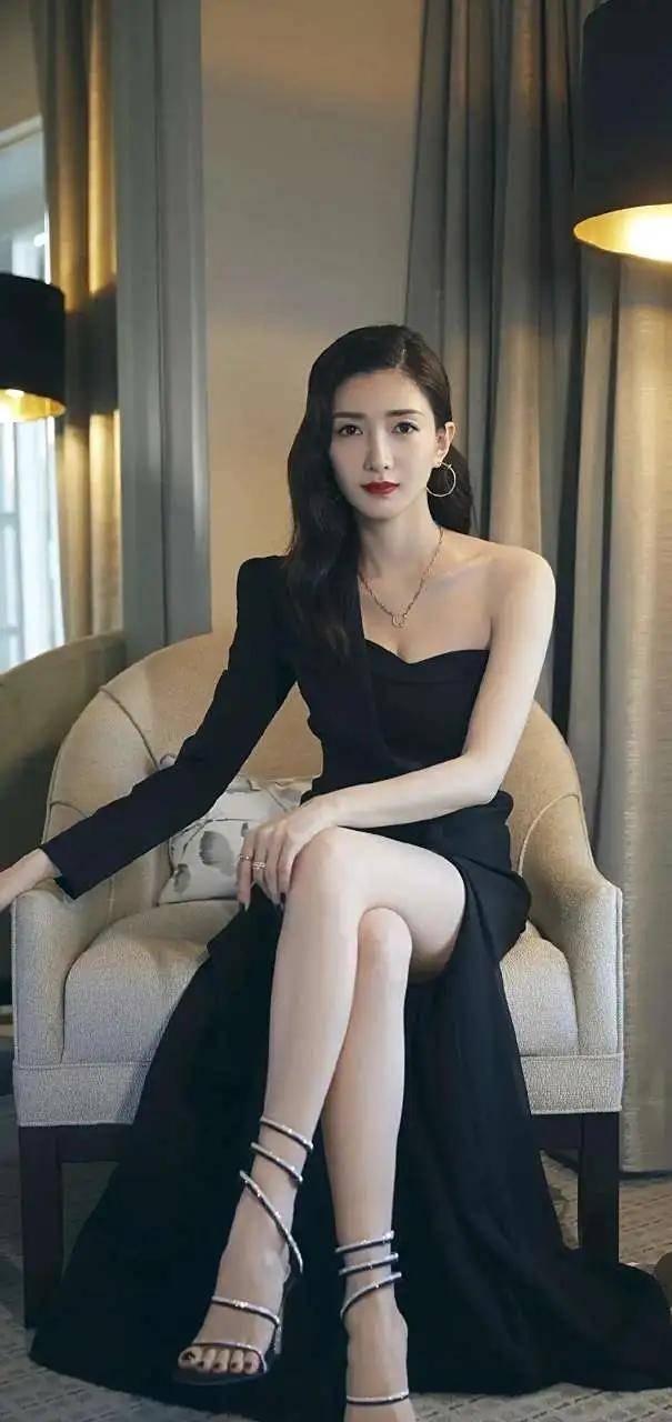江疏影穿着一袭黑色纱裙,她俏脸端庄秀丽,五官精致,长发飘逸,这位美女坐在沙发上,露出左边的斜肩和傲人的事业线,翘起自己的大美腿,更是性感撩人!