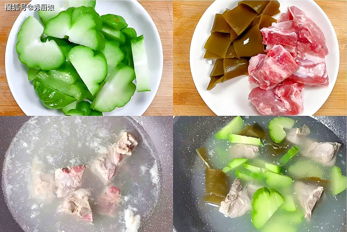 食材:猪肋排一根,佛手瓜一个,干海带结一小把,姜几片,枸杞少许。