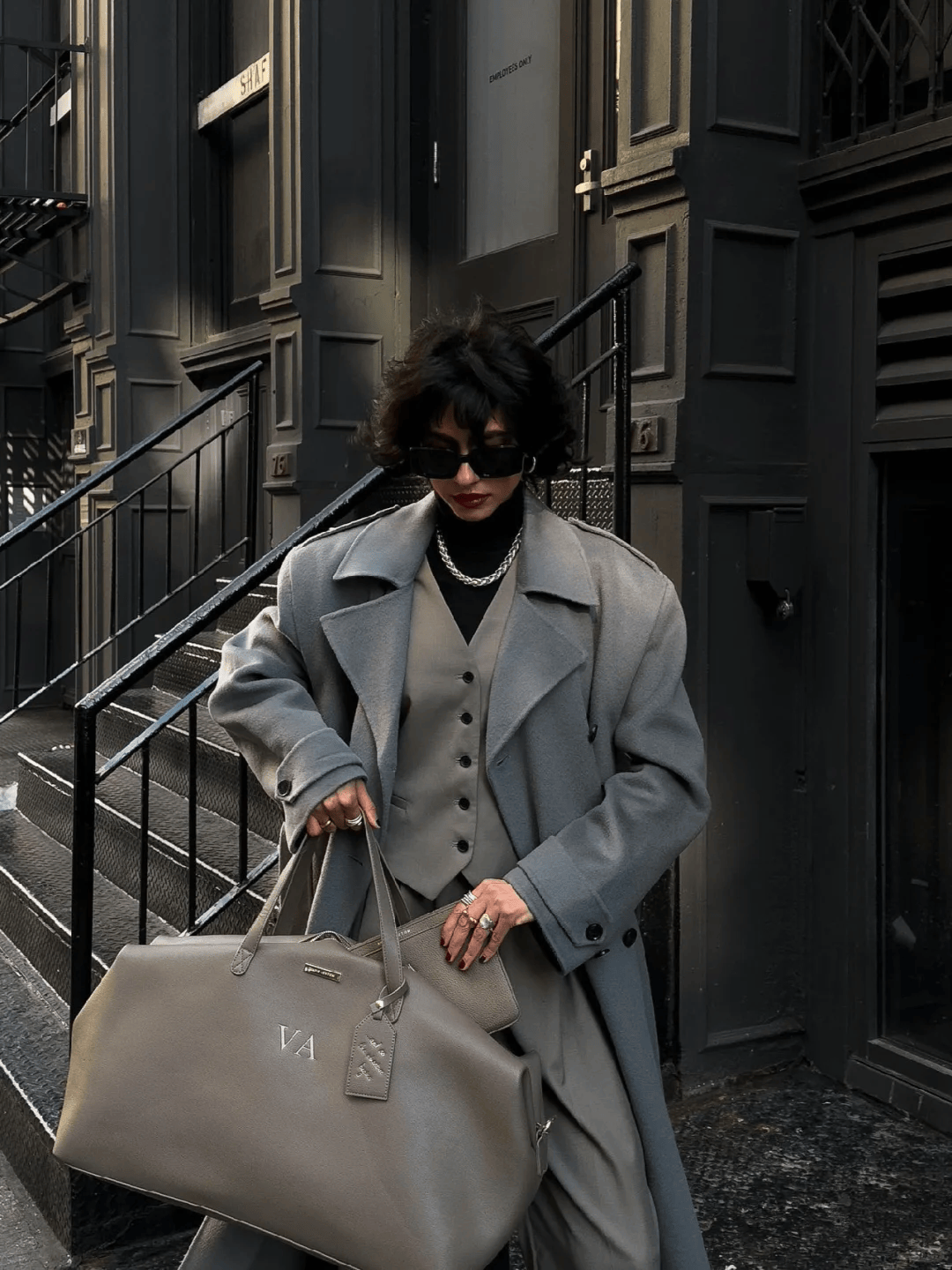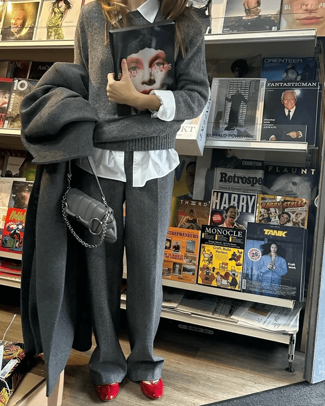 灰色的“清冷”需要一点“活色”来平衡,但顶奢感从不是“大面积撞色”。选小面积的亮色配饰:比如亮黄色的手包、宝蓝色的短靴,或一条银灰色丝巾,像“撒在灰布上的星光”,打破单调却不张扬,反而凸显灰色的高级。