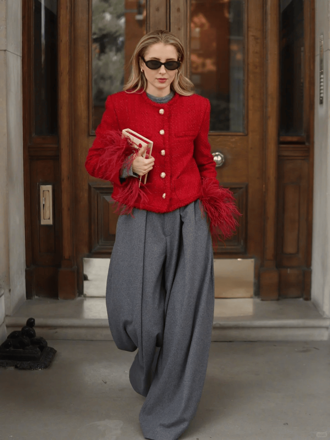 冬季穿搭中,可以用灰色阔腿裤搭配红色小香风外套。