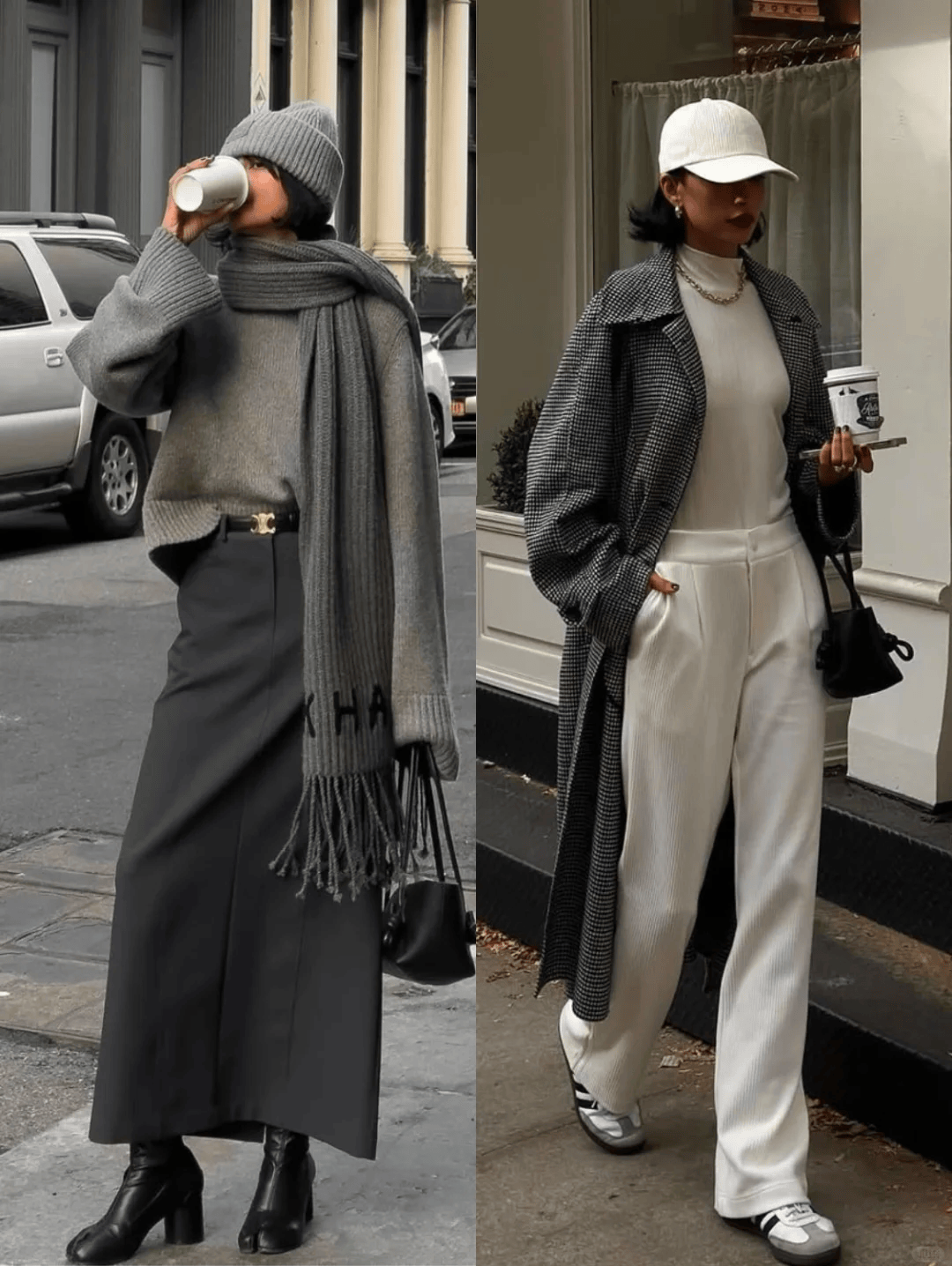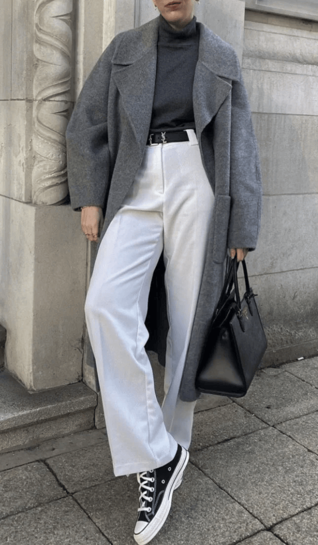 冬季穿搭中,可以用灰色大衣搭配白色直筒裤,或者用灰色毛衣搭配白色半身裙,都是非常不错的选择。